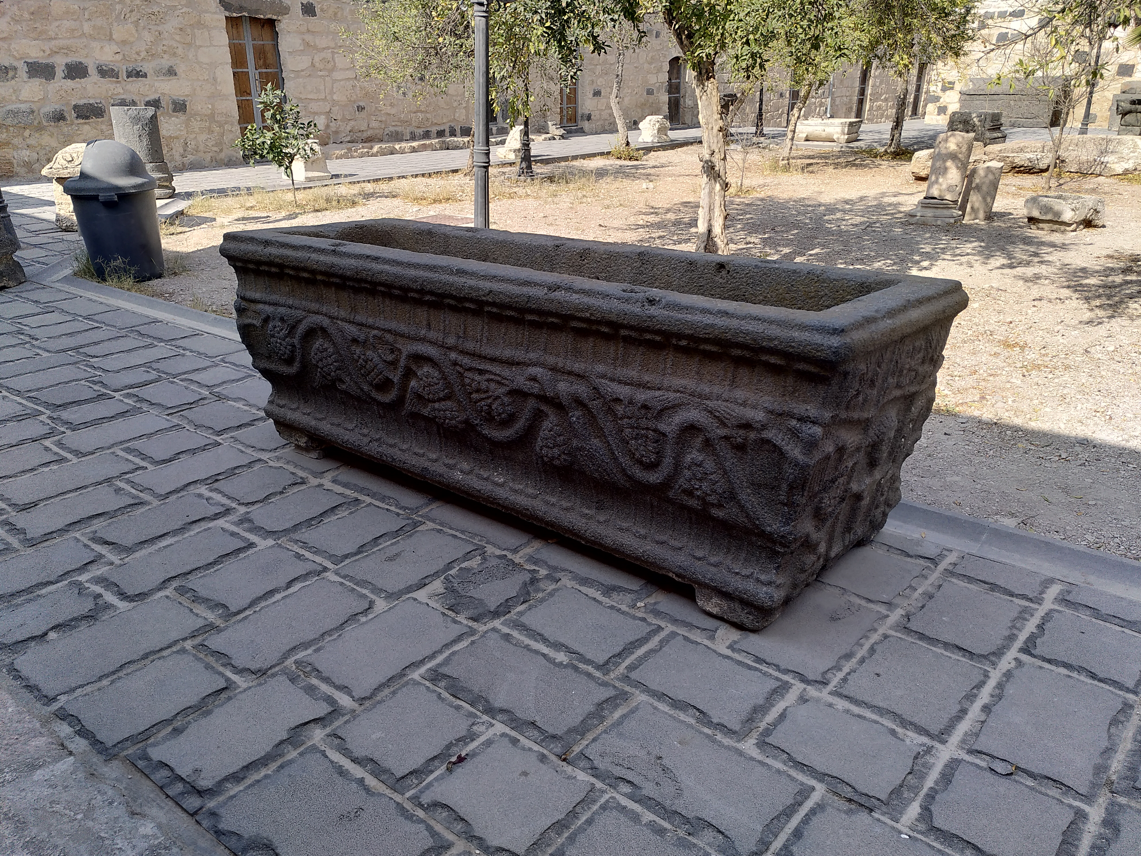 The work was completed in 2019. The rooms of the museum tell the history of the site and its surroundings, from the Bronze Age to the Islamic period. The elegant courtyard houses rich capitals, stone sarcophagi, mosaics, inscriptions and basalt doors. The courtyard also houses a colossal statue of Tyche enthroned, discovered in the 1960s, which dates from the second quarter of the 2nd century CE and decorated the orchestra of the western theatre.